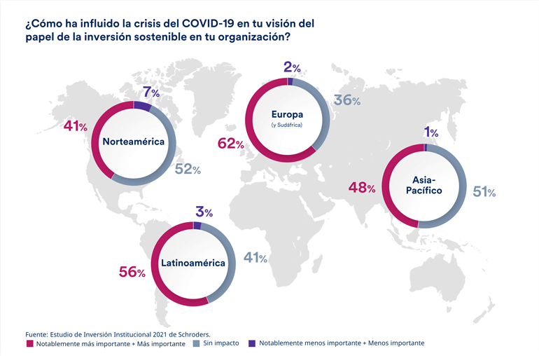 Más de la mitad de los inversores institucionales piensan que los factores ASG son más importantes debido al COVID-19. Este es el caso en particular de los inversores europeos: el 62% de ellos concede ahora una mayor importancia a los factores ASG. Norteamérica es un caso atípico en este sentido, ya que el 52% afirma que la pandemia no ha tenido ningún impacto en la importancia de la inversión ASG, mientras que el 7% considera que es menos importante.