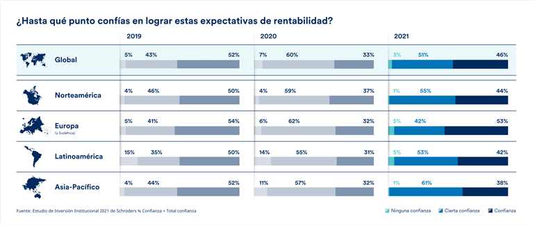 En general, el 46% de los inversores institucionales se declararon «seguros» de cumplir sus expectativas de rentabilidad, frente al 33% en 2020.