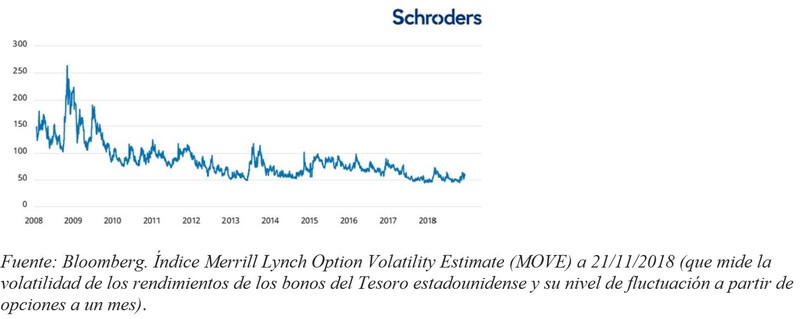 Durante la mayoría del periodo posterior a la crisis financiera, los mercados de renta fija han disfrutado de una coyuntura de relativa calma, y la volatilidad (es decir, la medida en que fluctúan los precios) disminuyó drásticamente en un primer momento antes de estabilizarse en un nivel históricamente bajo (véase el gráfico).