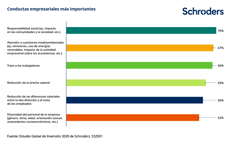 KD: “Estamos empezando a llamarlo un nuevo contrato social, en el que el lugar que ocupan las empresas en sus comunidades y en el conjunto de la sociedad está cambiando. Eso también es importante para los clientes. El Estudio Global de Inversión de Schroders mostró cómo esperaban los inversores que las empresas priorizaran sus acciones para lograr un impacto en el medioambiente y la sociedad.”