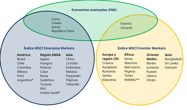 Por ejemplo, muchos países presentes en los índices MSCI de mercados emergentes e incluso frontera (el escalón previo a la clasificación de emergente) son avanzados en términos económicos (véase la siguiente imagen). Corea y Taiwán son ejemplos obvios. Según algunos parámetros (por ejemplo, el PIB per cápita, un parámetro sobre el nivel de vida), Taiwán está incluso más desarrollado que países como Canadá, el Reino Unido, Francia y Japón [2]. Además, las empresas de estos mercados también pueden figurar entre los líderes mundiales en sus respectivos sectores, como Samsung Electronics y Taiwan Semiconductor, aunque estén clasificadas como compañías de mercados emergentes.