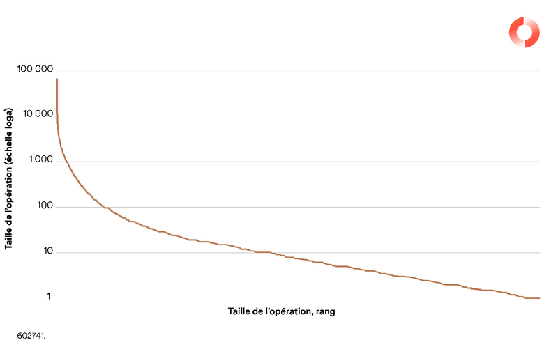 Exemple : Opérations de private equity par taille et par rang (M$ - échelle loga)
