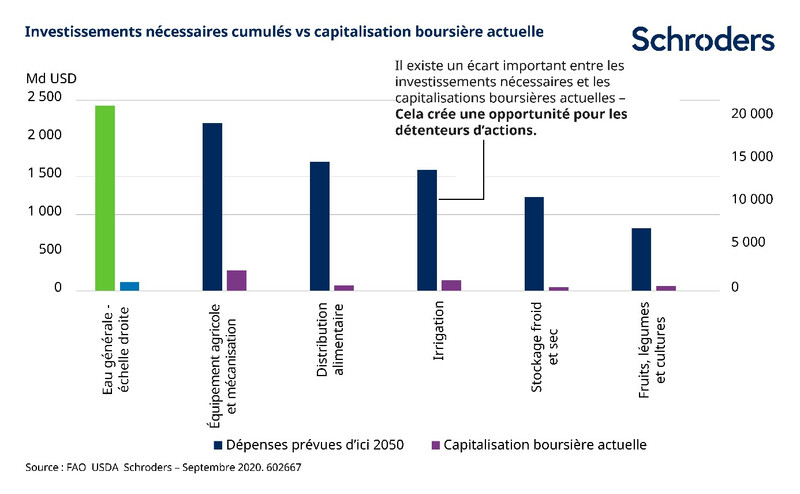 D’énormes investissements sont nécessaires pour rendre le système durable. Nous estimons que 30 000 milliards USD doivent être dépensés dans les différentes chaînes de valeur de l’alimentation et de l’eau d’ici 2050. Le graphique ci-dessous compare les investissements requis et la capitalisation boursière actuelle des entreprises de certains secteurs liés à l’alimentation et à l’eau. Comme on peut le constater, il existe un écart frappant.