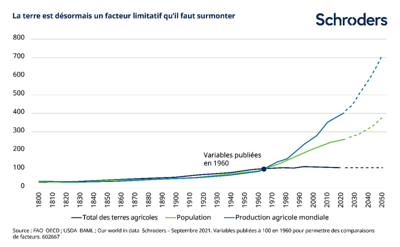 Le graphique ci-dessous montre l’amélioration de l’efficacité de la production agricole avec l’accroissement de la population mondiale. Toutefois, les lignes pointillées indiquent l’ampleur du défi à relever.
