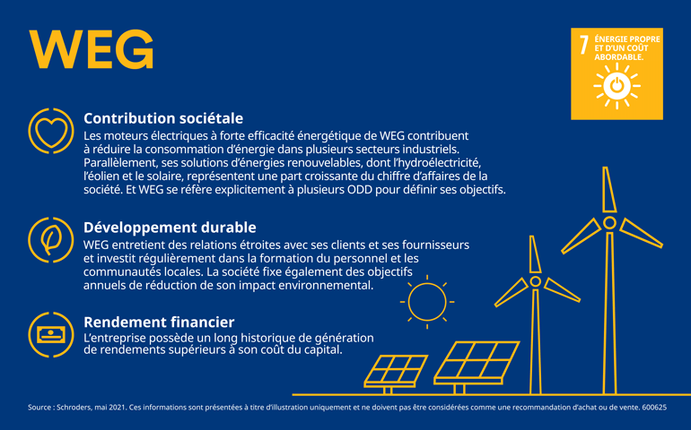 Les moteurs électriques de la société sont fabriqués pour un large éventail d’usages, allant de commercial à industriel. WEG est l’un des plus grands producteurs mondiaux de ces produits et investit massivement dans la recherche et le développement afin de réaliser des gains d’efficacité continus. La société possède 450 brevets dans le monde. Cela est non seulement bénéfique d’un point de vue concurrentiel, mais permet aussi de progresser vers la réduction de l’impact négatif sur l’environnement.