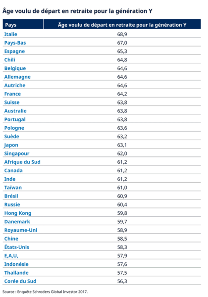 D’après ces résultats, qui portent sur 30 pays, la génération Y vise un départ en retraite à l’âge de 58,2 ans en moyenne.