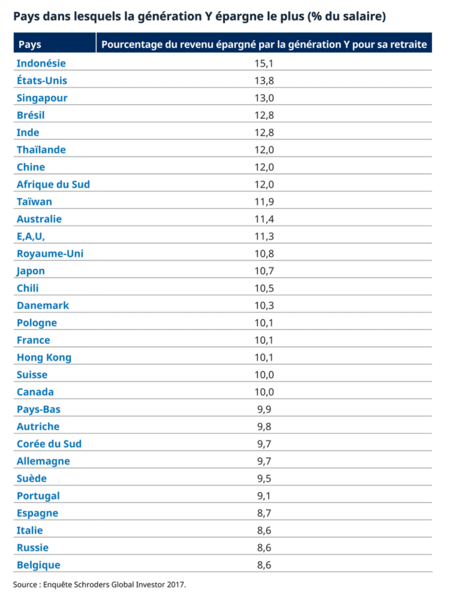En moyenne, les membres de la génération Y épargnent 11,2 % de leur revenu pour financer leur retraite, selon l’enquête Schroders Global Investor Study. C’est à peine moins que leurs aînés, qui épargnent 11,6 %.