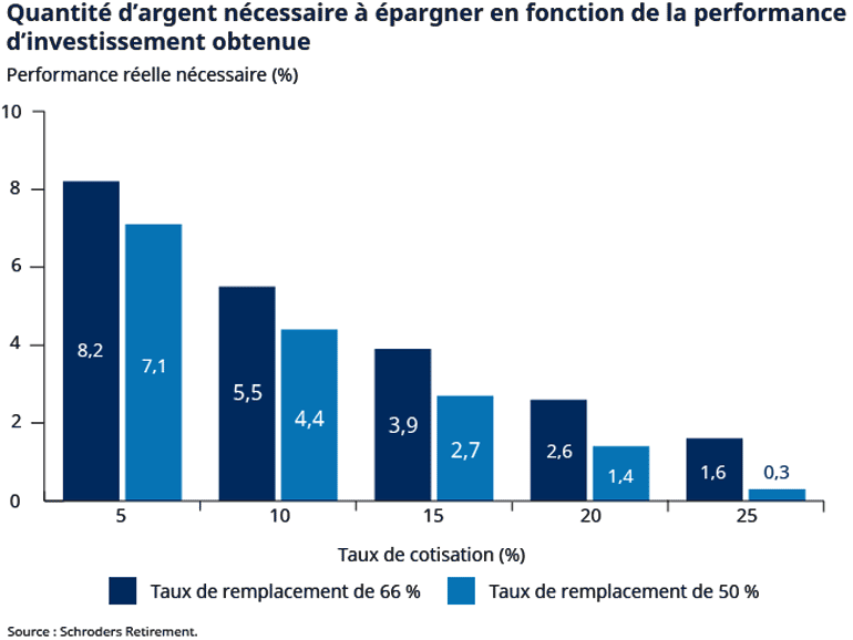 Source : Schroders Retirement. À titre indicatif uniquement. Début de l’épargne à 20 ans, départ en retraite à 60 ans. Salaire de départ de 25 000 GBP augmentant au même rythme que l’inflation. Taux de remplacement basé sur les taux d’annuité actuels générant respectivement un revenu de 66 % et 50 % du salaire final.