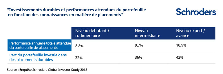 Les investisseurs considérant avoir des connaissances de niveau expert / avancé ont déclaré qu'ils allouaient en moyenne 42 % de leur portefeuille à des placements durables et qu'ils s'attendaient à une performance annuelle de 10,9 % en moyenne sur l'ensemble de leur portefeuille. En comparaison, ces chiffres sont de l'ordre de respectivement 32 % et 8,8 % pour les investisseurs qui se considèrent comme débutants.
