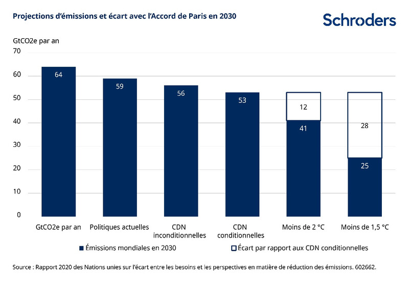 Dans les projections de l’ONU, même si toutes les CDN sont mises en œuvre, les émissions annuelles totales de gaz à effet de serre se stabiliseront à 53 gigatonnes d’équivalent CO2 (GtCO2e) en 2030 (cf. graphique 1).