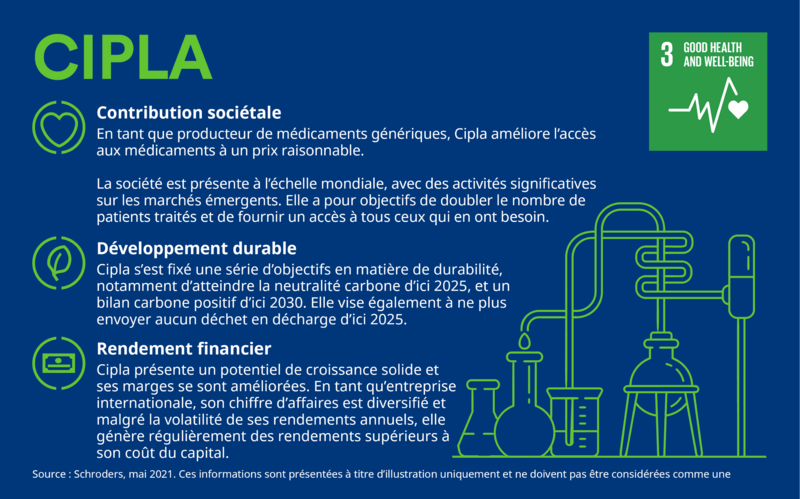 En améliorant l’accès aux médicaments et aux traitements, Cipla contribue à l’ODD 1, Éliminer la pauvreté sous toutes ses formes et partout dans le monde. Grâce à ses investissements en recherche et développement, notamment dans la chimie verte, qui contribue à réduire l’impact environnemental de la fabrication, elle cherche à contribuer à l’ODD 9, Industrie, innovation et infrastructures. La société prend également des mesures pour éviter l’incinération ou la mise en décharge des déchets co-traités, ce qui contribue à l’ODD 12, Consommation et production responsables.