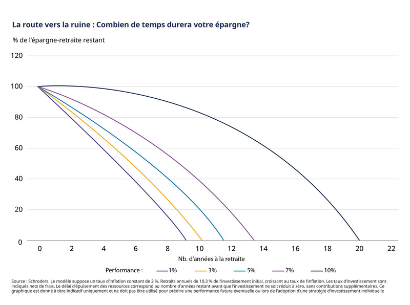 Le graphique ci-dessous, basé sur l’analyse de Schroders, montre les effets d’un taux de retrait de 10,3 % sur un portefeuille.