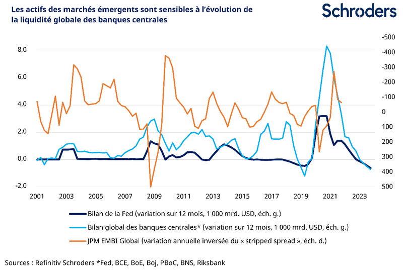 Quoi qu’il en soit, nos prévisions indiquent que la liquidité des banques centrales mondiales commencera à diminuer en 2023. Bien que ce ne soit pas le seul moteur de performance des marchés, cette évolution sera probablement un frein pour les actifs des marchés émergents. Les obligations libellées en dollar américain sont historiquement les plus sensibles au resserrement quantitatif, mais les actions et les devises seront également vulnérables.