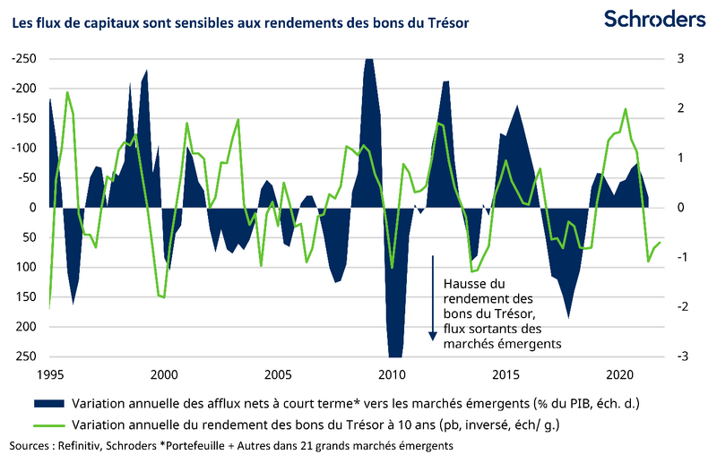 Alors que le bilan de la Fed est peu corrélé avec les flux de capitaux vers les marchés émergents, il existe une relation évidente avec l’évolution des rendements des bons du Trésor. A supposer que le resserrement quantitatif conduise à une forte hausse de ces derniers, les afflux de capitaux et la croissance des marchés émergents pourraient souffrir.