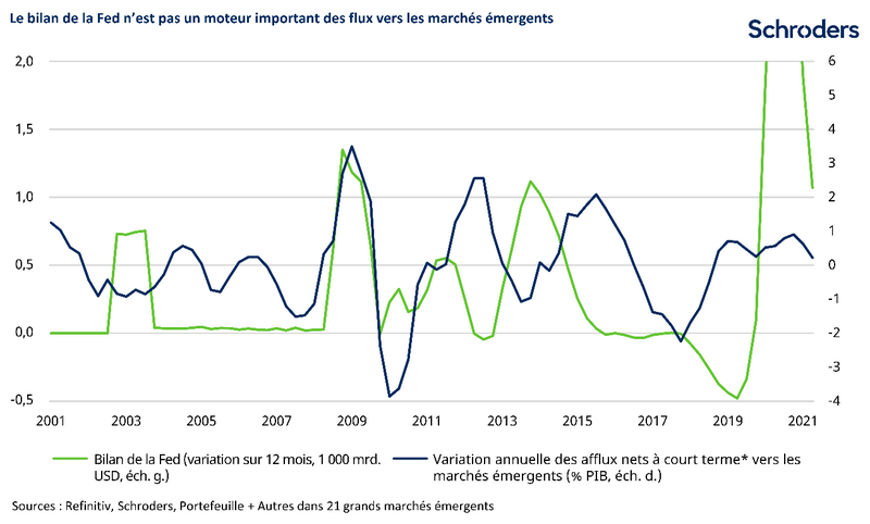 Il y a en fait très peu de relation directe entre l’évolution de la taille du bilan de la Fed et les flux de capitaux vers les marchés émergents. Comme le montre le graphique ci-dessous, au-delà de la période autour de la crise financière mondiale, les flux de capitaux et le bilan de la Fed ont souvent évolué dans des directions opposées.
