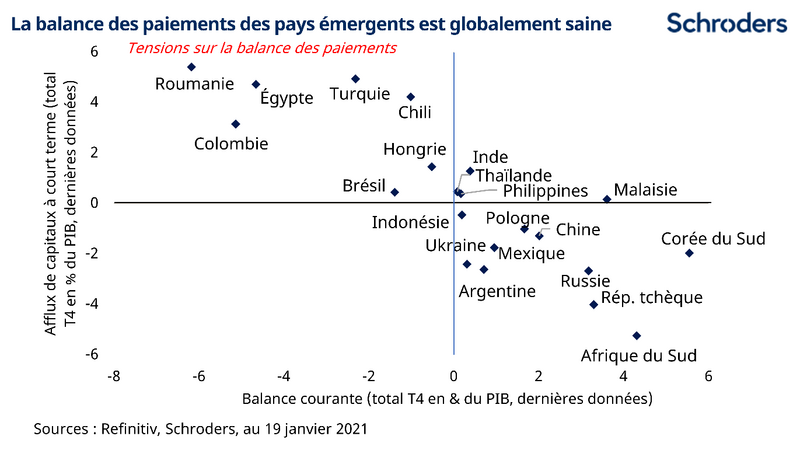 Sur le plan économique, la manière la plus évidente dont le resserrement de la liquidité mondiale en dollars pourrait peser sur les marchés émergents est au travers de la balance des paiements. Si le resserrement quantitatif réduit la liquidité en dollars, il pourrait exposer les marchés émergents qui dépendent des flux de capitaux étrangers pour financer leurs déficits extérieurs, forçant une réduction des importations et, en fin de compte, un ralentissement de la croissance économique.