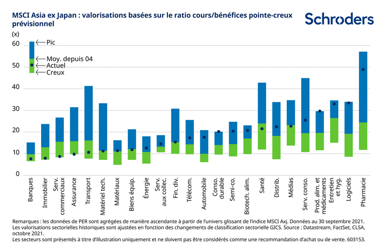 Parmi les segments du marché actions asiatiques qui semblent bon marché au regard des multiples de valorisation globaux figurent les banques, l’assurance et l’immobilier. Ces secteurs bénéficient généralement d’une hausse de l’inflation et des taux d’intérêt, de sorte que des opportunités d’amélioration des rendements à moyen terme peuvent se présenter si l’inflation se révèle plus que « transitoire ». Toutefois, ces secteurs sont confrontés à des défis structurels persistants du fait de l’essor des fintechs et du commerce électronique dans la région, ce qui limite notre enthousiasme.