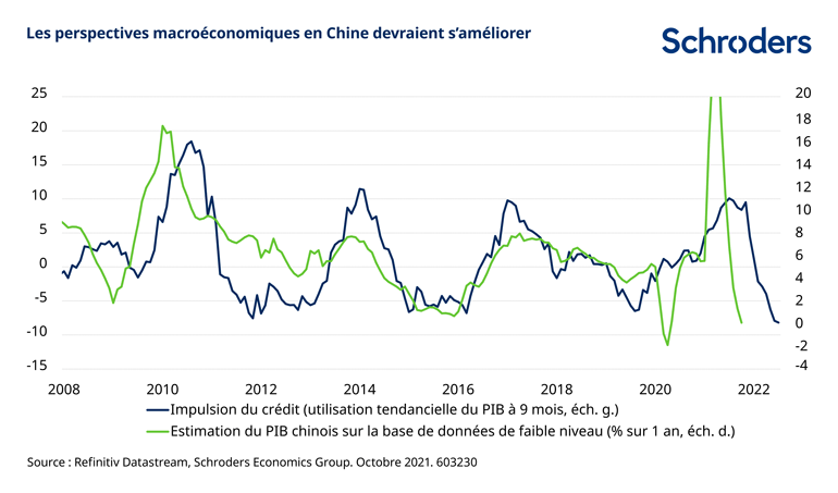 L’impulsion du crédit bancaire se manifeste habituellement au niveau de l’activité économique avec un décalage de neuf mois, comme le montre le graphique ci-dessous, laissant penser que l’économie chinoise restera morose jusqu’au milieu de l’an prochain. Toutefois, au second semestre 2022, les perspectives macroéconomiques chinoises pourraient s’améliorer. Bien que les bénéfices des entreprises soient impactés par le ralentissement de la croissance cette année, les marchés anticipent et pourraient commencer à intégrer le scénario d’une reprise.