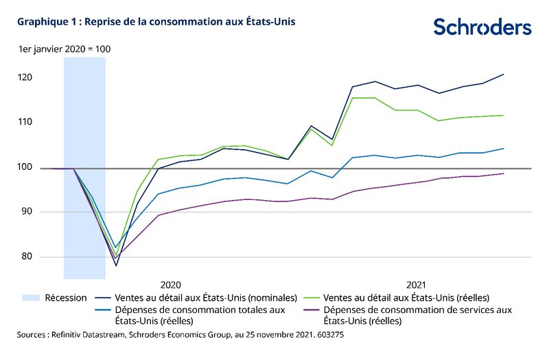 La nature déséquilibrée de la reprise se reflète dans les chiffres très suivis des dépenses de consommation aux États-Unis (cf. graphique 1). Ces données montrent que les volumes de ventes au détail, ou les ventes au détail réelles, sont désormais supérieurs de plus de 10 % à leur niveau d’avant la pandémie. En revanche, les chiffres des dépenses réelles dans le secteur des services sont encore inférieurs d’environ 2 % à ceux d’avant la crise sanitaire.