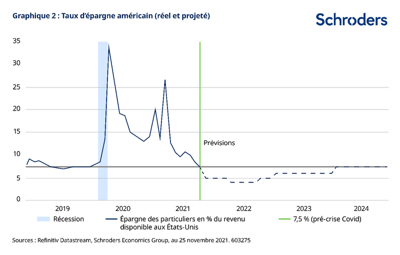 Sur ce front, le consommateur est essentiel et on s’attend à que les ménages dépensent l’épargne qu’ils ont accumulée pendant les périodes de confinement. En pratique, cela impliquerait une baisse du taux d’épargne en dessous de sa moyenne prépandémique de 7,5 % à mesure que l’épargne excédentaire est dépensée (cf. graphique 2, ci-dessous).