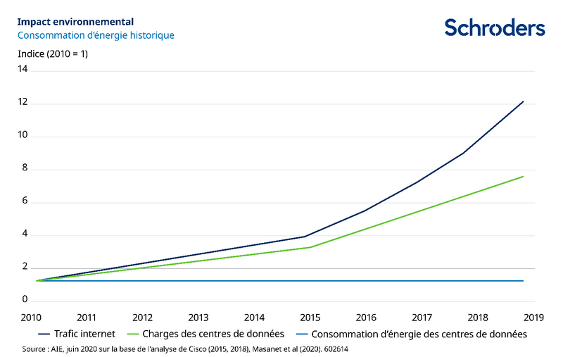 Les projections de l’Agence internationale de l’énergie (AIE) suggèrent que le trafic internet doublera entre 2019 et 2022, la pandémie de Covid-19 s’ajoutant à cette tendance grâce à une demande accrue de la part de domaines tels que les jeux en ligne, la visioconférence et la diffusion en continu.