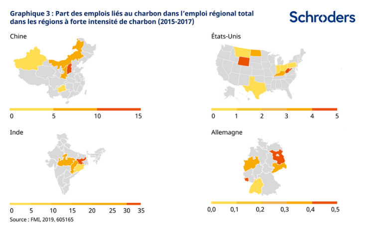 Les énergies fossiles sont utilisées partout, mais les lieux d’extraction, de raffinement et de production sont géographiquement localisés. Une étude réalisée par le FMI[3] montre que les mines de charbon, par exemple, se concentrent dans quelques régions clés, puisque le charbon ne peut être extrait qu’aux endroits où se trouvent les gisements houillers (graphique 4). Autrement dit, les déplacements d’emplois à grande échelle résultant de la fermeture de mines de charbon peuvent affecter des communautés entières, avec le risque de laisser les économies locales avec peu d’opportunités économiques.