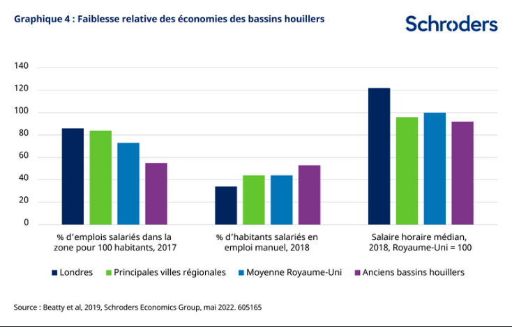 Un autre constat clé est que malgré la disparition de l’industrie houillère, ces régions ont tendance à maintenir une structure professionnelle toujours orientée vers les professions manuelles. Dans ces régions, 53 % des résidents ayant un emploi travaillent dans des professions manuelles, soit un pourcentage bien au-dessus de la moyenne nationale de 44 %.