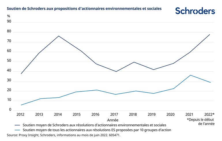 En matière de vote, nous avons historiquement soutenu davantage de résolutions d’actionnaires que beaucoup de nos plus grands concurrents. Mais notre soutien – ou notre objection – dépendra toujours de la précision ainsi que de l’adéquation de la formulation des résolutions, et nous voterons sur la base d’une compréhension détaillée du modèle économique d’une entreprise et de ses progrès à ce jour sur les questions ESG.