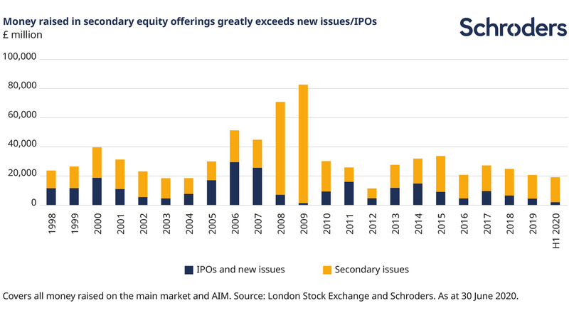 Nor is this just a flash in the pan. Since 1998, around twice as much has been raised via such secondary offerings – the issuance of new equity by existing public companies, most commonly via rights issues or placings – than initial public offerings/new issues. Since 2015 the equivalent multiple has been around three times.