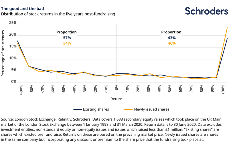 The disappointing news is that most companies that raise additional equity go on to underperform their sector (64% over three years and 66% over five years) – according to Schroders’ research into 1,638 secondary equity issues that took place on the UK main market of the London Stock Exchange between January 1998 and March 2020.
