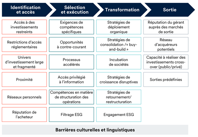 La prime de complexité peut être captée tout au long du processus d’investissement, du sourcing à la transformation jusqu’à la sortie d’un investissement. La perception de la prime de complexité pendant la phase de transformation dépend des capacités opérationnelles du gérant du fonds et de l’équipe de direction de l’actif sous-jacent.