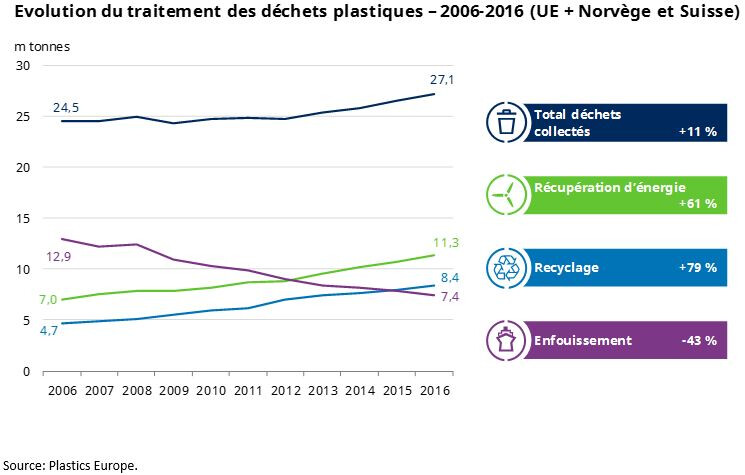 Les pressions pour l'élimination progressive du plastique provenant des politiques, de la réglementation et de la sensibilisation des consommateurs devraient disrupter le secteur de la gestion des déchets. Les infrastructures commencent à être réglementées en Europe, et la récente décision de la Chine de restreindre les importations de déchets (dont la plupart viennent des États-Unis, du Japon et d'Allemagne) incitera d'autres régions à investir et à innover pour relancer leurs industries du recyclage. Logiquement, les pays qui dépendent de la Chine seront les premiers à devoir revitaliser leurs industries. L'Europe est déjà relativement avancée dans le recyclage des déchets plastiques, avec une augmentation de près de 80 % sur la dernière décennie, comme le montre le graphique ci-dessous, mais le potentiel de progression reste fort.