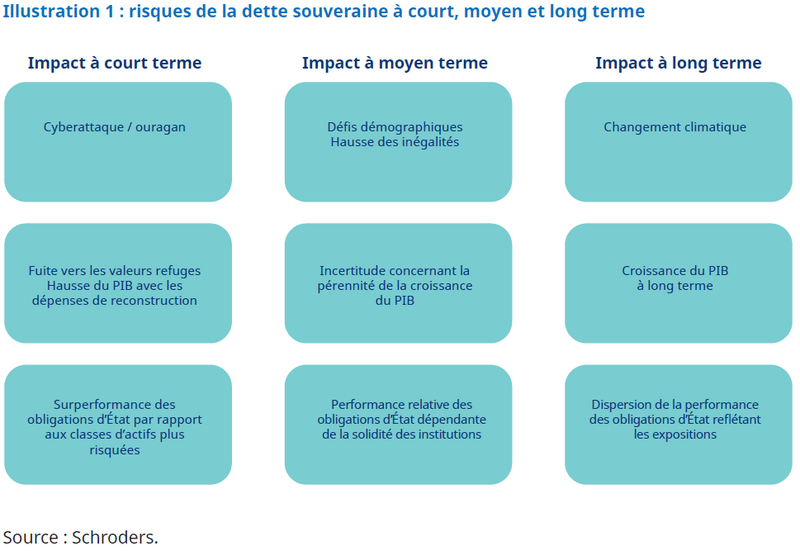 Les investisseurs cherchant à générer un alpha ESG devraient plutôt se tourner vers des risques à développement « moyen » ou « long ». Il s’agit de changements qui s’affirment sur la durée, impactant les taux de croissance du PIB et finalement la soutenabilité de la dette.
