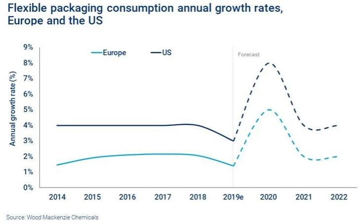 L’entreprise Wood Mackenzie, spécialisée dans l’intelligence de marché, avait prédit que la demande d’« emballages flexibles » de la part des consommateurs augmenterait de 5 % en Europe cette année, et ce, malgré un recul en deçà de 1,5 % l’an dernier (cf. graphique ci-dessous).