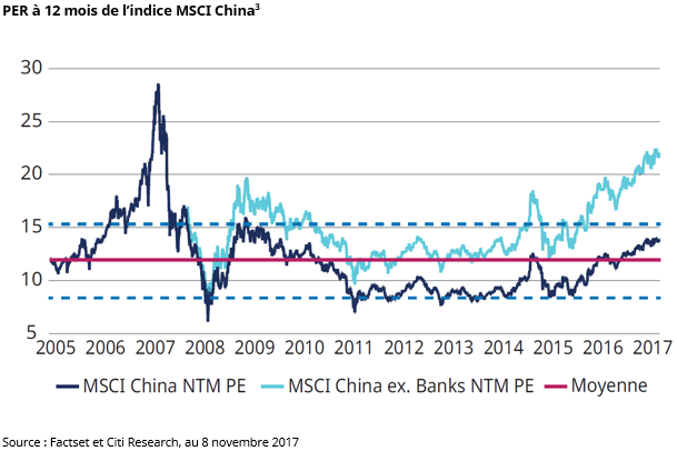 Les valorisations sont désormais élevées suite à la forte hausse du marché. Au 30 novembre 2017, l’indice affichait un ratio cours-bénéfices (PER) proche de 15 et un ratio cours-valeur comptable de 1,92, niveaux supérieurs aux fourchettes historiques dans les deux cas. Si l’on exclut les valeurs bancaires chinoises (peu onéreuses), l’indice présente en fait un PER de 22. Sachant que le couple risque-rendement à ce stade est désormais moins favorable, nous avons opté pour une plus grande prudence à l’approche de 2018.