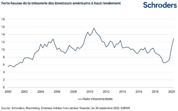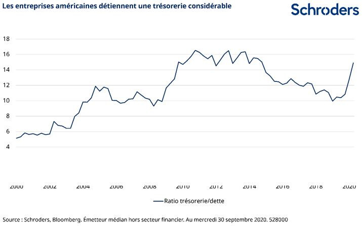 Nous abordons 2021 avec un taux d’endettement record des entreprises. Ces dernières ont levé d’énormes montants sur les marchés obligataires en 2020 pour s’assurer de pourvoir traverser la crise. Des signes laissent penser que cette situation a atteint un pic, que la trésorerie des entreprises a augmenté et que les bilans pourraient commencer à s’améliorer.
