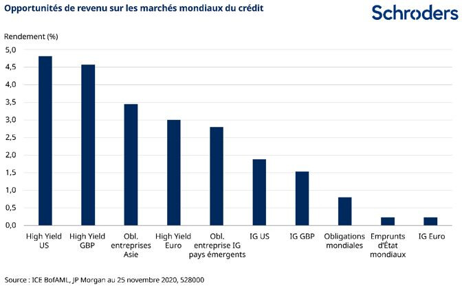 « Bien que les rendements dans certains segments du marché mondial des créances d’entreprise soient plutôt faibles, notamment en Europe, d’autres segments du marché, comme celui en dollars, offrent des rendements plus élevés, même en tenant compte de l’inflation. Le positionnement au niveau des secteurs, des régions et des entreprises sera un facteur déterminant de la performance en 2021. »