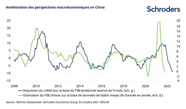 Nous serons également attentifs au redressement des indicateurs économiques avancés afin de déceler des signes d’amélioration à venir. Par exemple, si l’impulsion du crédit - la variation sur 12 mois de la part des nouveaux prêts dans le PIB - a continué de baisser en octobre 2021, signalant des conditions économiques moroses jusqu’à l’été 2022, elle a connu un rythme plus lent. L’impulsion pourrait s’essouffler et s’accélérer vers le début de l’année, impliquant une amélioration de l’activité au second semestre 2022.