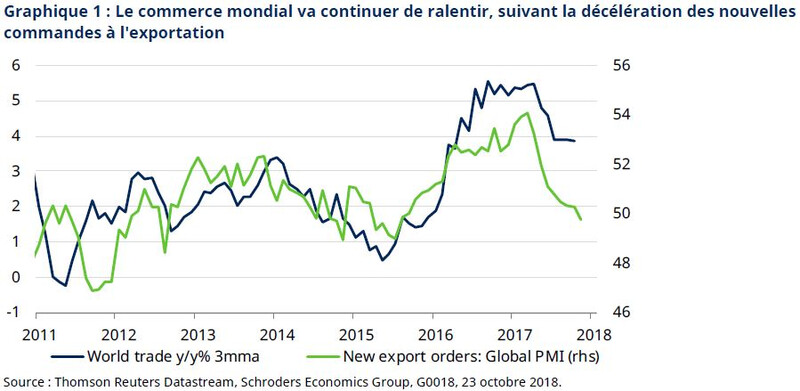 Les perspectives du commerce mondial s'annoncent difficiles, car les indicateurs prospectifs, tels que l'indice mondial des directeurs d'achats (PMI) des commandes à l'exportation, laissent entrevoir une nouvelle décélération au cours des prochains mois. Les nouvelles commandes à l'exportation sont un indicateur de l'activité commerciale future. Il semble donc peu probable qu'une reprise du commerce mondial entraîne une nouvelle convergence de la croissance mondiale.