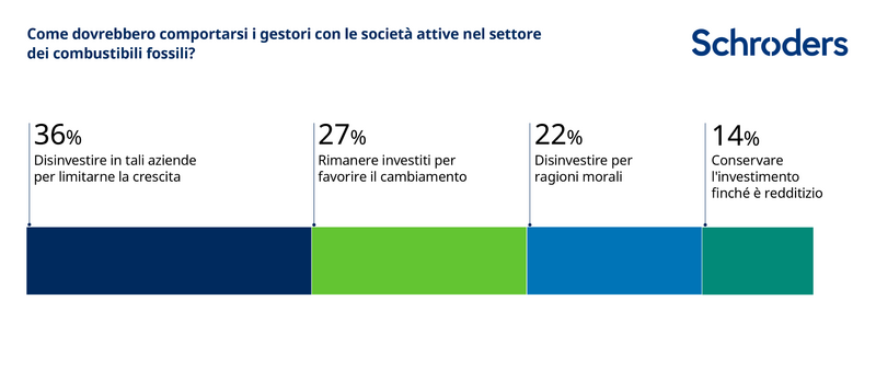 Poco più di un terzo (36%) crede che i gestori dovrebbero ritirare capitali dal settore dei combustibili fossili per limitarne la crescita. Tuttavia, oltre un quarto (27%) pensa che i gestori dovrebbero rimanere investiti per guidare il cambiamento e il 14% dichiara che dovrebbero mantenere l'investimento finché sarà redditizio.