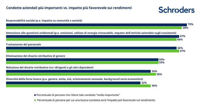 Secondo l'ultimo Global Investor Study di Schroders, tra le questioni legate alla sostenibilità, gli investitori attribuiscono particolare rilevanza al generale impatto sociale delle aziende.