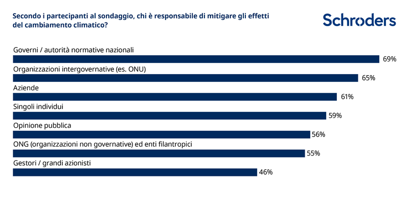 Quasi la metà degli intervistati (46%) ritiene che i gestori di investimenti o i grandi azionisti dovrebbero essere responsabili della lotta al cambiamento climatico.