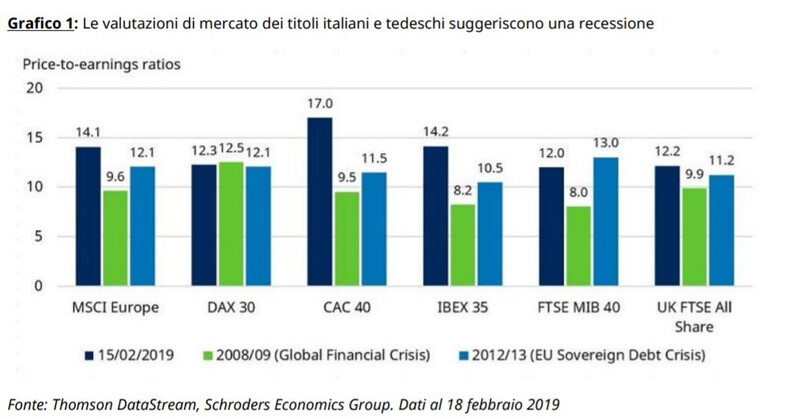 Nonostante il difficile contesto globale, l’economia dell’Eurozona ha continuato ad espandersi nel 2018, sebbene la crescita trimestrale sia scesa allo 0,2% negli ultimi due trimestri dell’anno. Tuttavia, alcune valutazioni dell’azionario europeo sono crollate raggiungendo livelli che implicano una recessione già in corso.