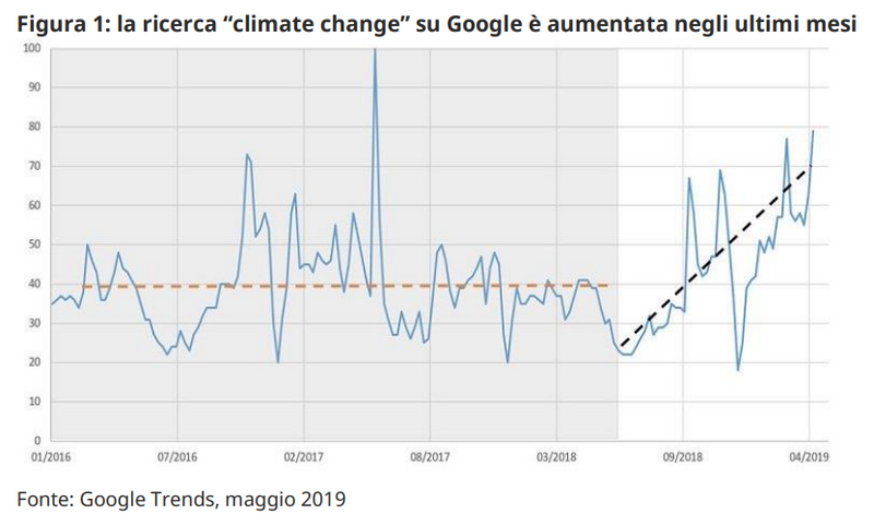 La Figura 1 conferma che l’attenzione sul cambiamento climatico sta crescendo. La linea di tendenza della ricerca “climate change” è sempre stata piatta in passato, eccetto picchi e cali stagionali e l’impennata durante la Conferenza di Bonn sui Cambiamenti Climatici di maggio 2017, evento che fu molto pubblicizzato. Tuttavia, nel corso degli ultimi 12 mesi, questa linea di tendenza sta crescendo in maniera costante.