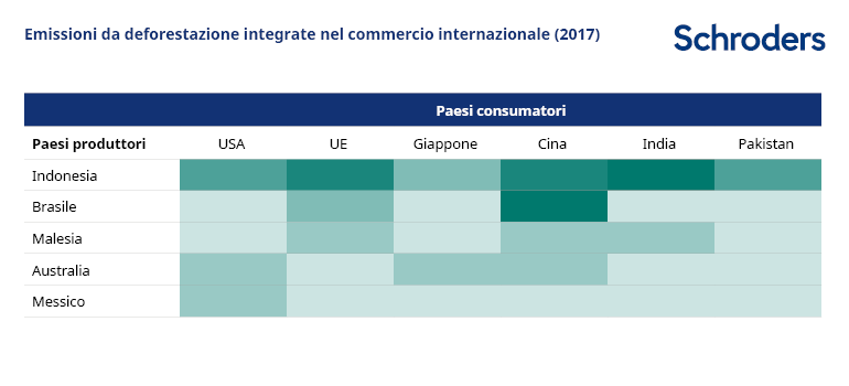 Alla luce della natura globale e interconnessa delle filiere, considerare solo il paese produttore impedisce di avere un quadro d’insieme. L’analisi delle emissioni da deforestazione integrate nel commercio internazionale evidenzia che il primo esportatore di queste commodity è l’Indonesia e non il Brasile, dove invece sono i consumi interni a essere elevati. La Cina è il principale importatore, seguita da Unione Europea e India.