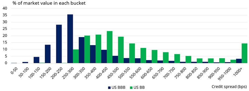 I mercati del credito globale hanno preceduto le agenzie di rating nel prezzare i downgrade. Sicuramente all'interno del segmento con rating BBB negli Stati Uniti, i rischi di downgrade sono già prezzati con livelli di spread più bassi. Come si può vedere dal grafico sottostante, una larga parte del mercato BBB scambia già a livelli di spread che ci si aspetterebbe di trovare nel segmento BB. Riteniamo che gli investitori possano trarre beneficio da gestori che hanno la flessibilità di investire sia nei mercati investment grade che high yield e che non siano obbligati a vendere. Inoltre, riteniamo che gli investitori possano beneficiare maggiormente da una ricerca bottom-up più lungimirante in grado di valutare la futura traiettoria di un'azienda e se lo spread attuale fornisca una compensazione sufficiente sulla base di queste metriche.