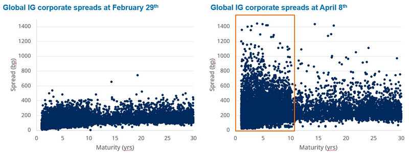 All'inizio di aprile, abbiamo parlato di come prima della pandemia di Covid-19 il livello di dispersione nei mercati obbligazionari a spread (sia a livello di settori che società) fosse molto basso (elevata concentrazione), con scarsa differenziazione tra i diversi segmenti. Dopo sei settimane, a seguito di un sell-off altamente indiscriminato, la realtà è ora molto differente. I grafici sottostanti mettono a confronto la dispersione degli spread creditizi nel mercato globale Investment Grade alla fine di febbraio e all'inizio di aprile. Il segmento a breve termine ha visto una netta dislocazione, amplificata dalle condizioni di liquidità. In generale, però la più ampia differenziazione tra i singoli emittenti riscontrabile ora crea importanti opportunità per i gestori attivi con approccio bottom-up.