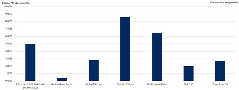 I livelli di income nei mercati obbligazionari a spread sono cambiati rapidamente in risposta alle valutazioni e alle politiche monetarie messe in atto dalle banche centrali. Come si può vedere dai grafici sottostanti, i titoli di stato globali stanno ora rendendo meno dello 0,5%, le obbligazioni corporate globali investment grade (IG) stanno offrendo poco più del 2,5% e il più rischioso settore high yield (HY) raggiunge l’8,5%. La strategia Schroder ISF* Global Credit Income, che mira a combinare in modo flessibile le esposizioni nell'intero universo creditizio globale con una preferenza per il mercato investment grade (80%), presenta attualmente un rendimento effettivo di oltre il 5% e un obiettivo di distribuzione fissa trimestrale del 3% p.a. (classe A Dis EUR Hedged).