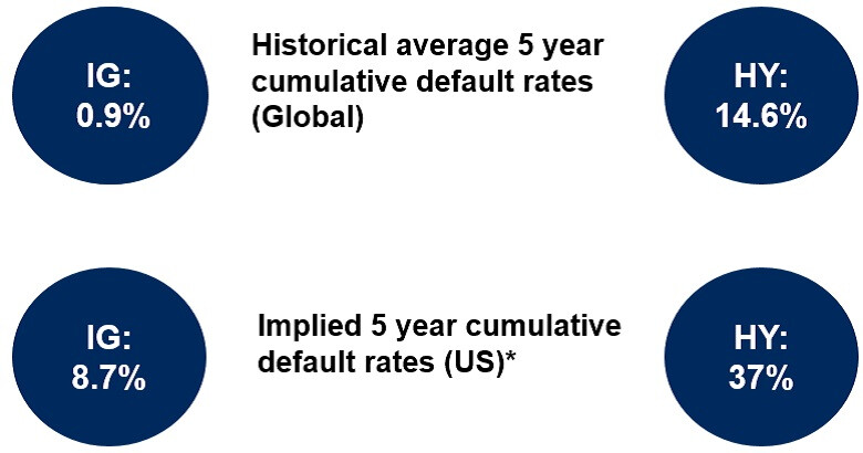 Nonostante sia probabile che i default aumentino a causa dello stress nel mercato, riteniamo che le previsioni stesse siano un po’ esagerate e che, per i gestori attivi come noi, ciò sia un’opportunità per sfruttare questa eccessiva aspettativa di default attraverso un'attenta selezione dei titoli. Se confrontiamo ciò che è stato valutato nel mercato in termini di default a 5 anni rispetto alla media storica, possiamo vedere che il tasso di default medio a 5 anni per il segmento IG è stato dello 0,9%, mentre gli attuali livelli di spread IG implicano un tasso dell'8,7%. E se guardiamo al mercato HY, il default medio storico è del 14,6% rispetto all'attuale tasso di default implicito del 37%.