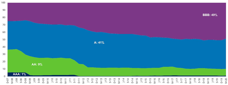 Una delle domande che la maggior parte degli investitori al momento si sta ponendo riguarda l'estensione e l'impatto dei downgrade dei rating creditizi. Inevitabilmente, il “rischio fallen angels" è in aumento. Il grafico seguente mostra l'attuale peso di ciascun bucket di rating all'interno dell'indice obbligazionario globale corporate IG, con i bond con merito creditizio pari a BBB (un gradino appena sopra all'high yield) in aumento e che rappresentano quasi il 50% dell'indice. Tuttavia, la Federal Reserve (Fed) ha annunciato che acquisterà anche i cosiddetti fallen angels (obbligazioni declassate al livello non-investment grade). Questo è un punto di svolta per le obbligazioni con rating BBB e ha rimosso il rischio di coda associato ad alcuni di questi investimenti.